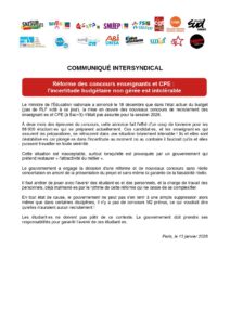 Le ministre de l'Éducation nationale a annoncé le 18 décembre que dans l'état actuel du budget (pas de PLF voté à ce jour), la mise en œuvre des nouveaux concours de recrutement des enseignant·es et CPE (à Bac+3) n'était pas assurée pour la session 2026.