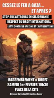 Le prochain rassemblement pour la Palestine à Rodez aura le 1er février à 10H30 Place de la Cité.