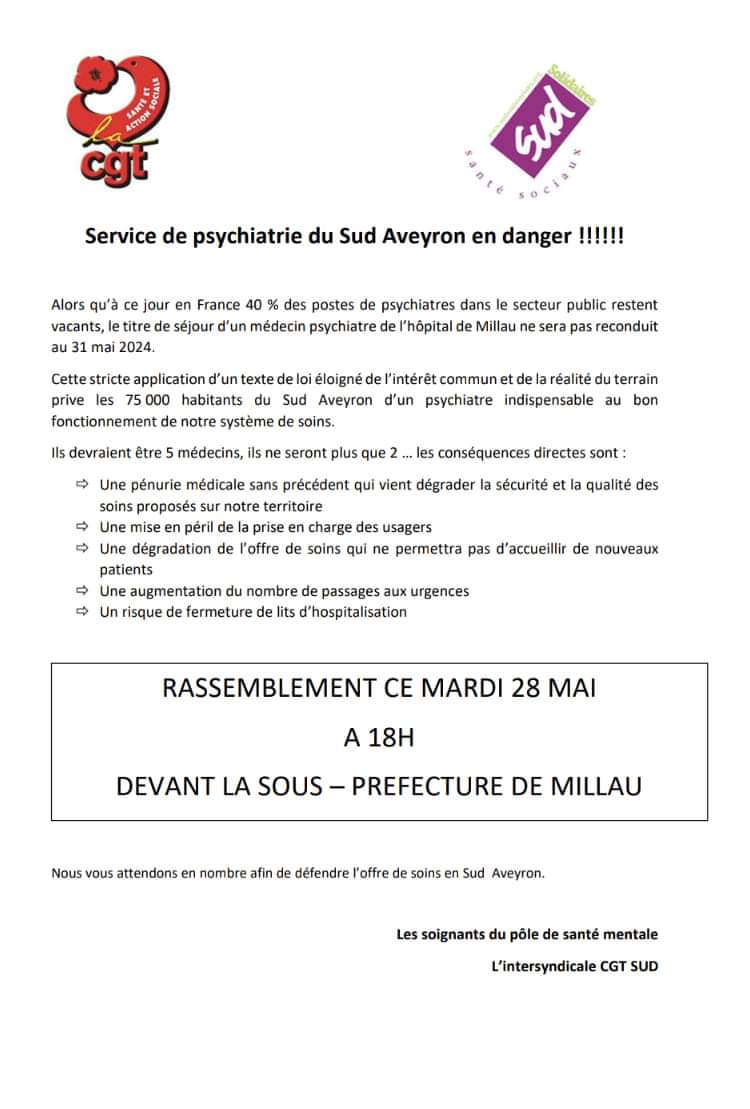 Houcine TURKI un de nos trois médecins, exerce comme psychiatre dans le secteur du Sud Aveyron. Après deux ans de bons et loyaux service au sein du secteur et de la FONCTION PUBLIQUE hospitalière, il se retrouve remercié par une obligation de quitter le territoire français avant ce 31/05/2024 ! Son titre de séjour arrive à sa fin et il ne peut prétendre à le reconduire du fait qu’il n’a pas encore passé son équivalence médicale (il devait soutenir son mémoire au Sénégal mais la situation politique l’en a empêché). Il est donc contraint de rentrer en Tunisie d’ici 15 jours. Au-delà du drame humain que cela représente, quid de la prise en charge de plus de 1200 patients de sa fille active qui vont se retrouver sans médecins…