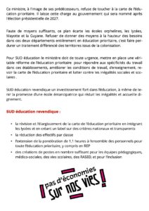 Pour SUD éducation le ministère doit de toute urgence, mettre en place une véritable réforme de l’éducation prioritaire pour répondre aux spécificités du travail dans ces établissements, améliorer les conditions de travail, d’enseignement, revoir la carte de l’éducation prioritaire et lutter contre les inégalités sociales et scolaires .